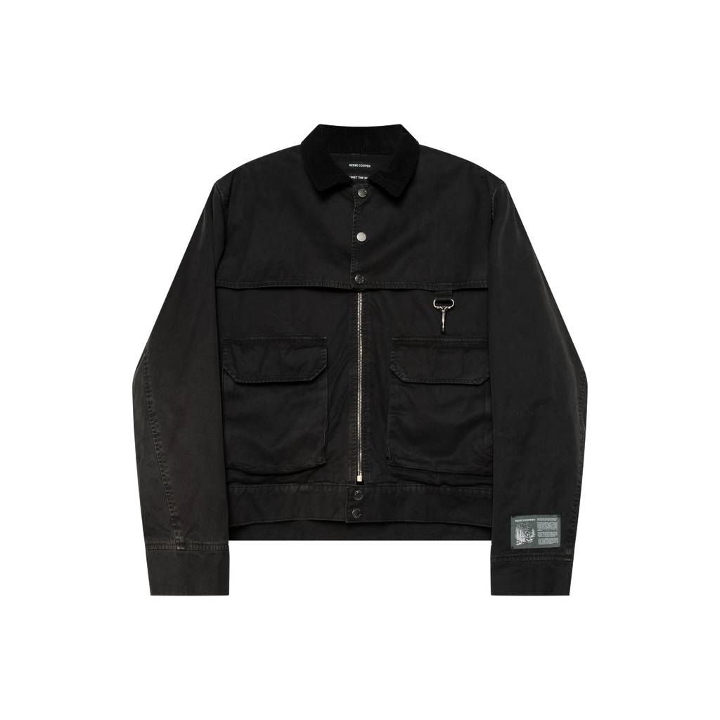 Reese Cooper Utility Jacket features front zip closure, flap pockets, lobster clasp at the chest, logo patch on left sleeve, and corduroy classic collar.