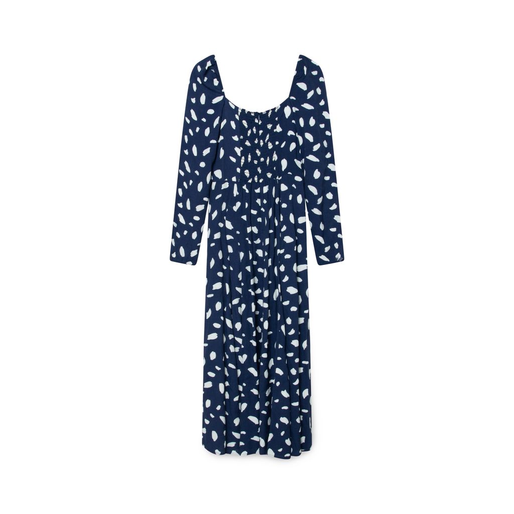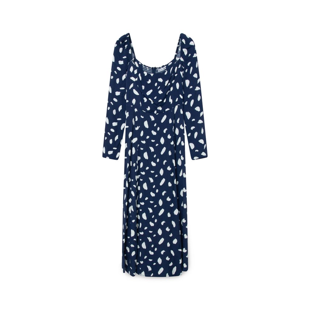Reformation Sigmund Dress in Moray features center back zip, elastic at cuffs and shoulders, high slit, square neckline, slightly puffed shoulders, and slim fitting bodice.