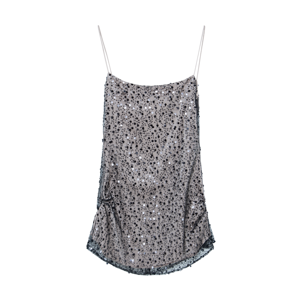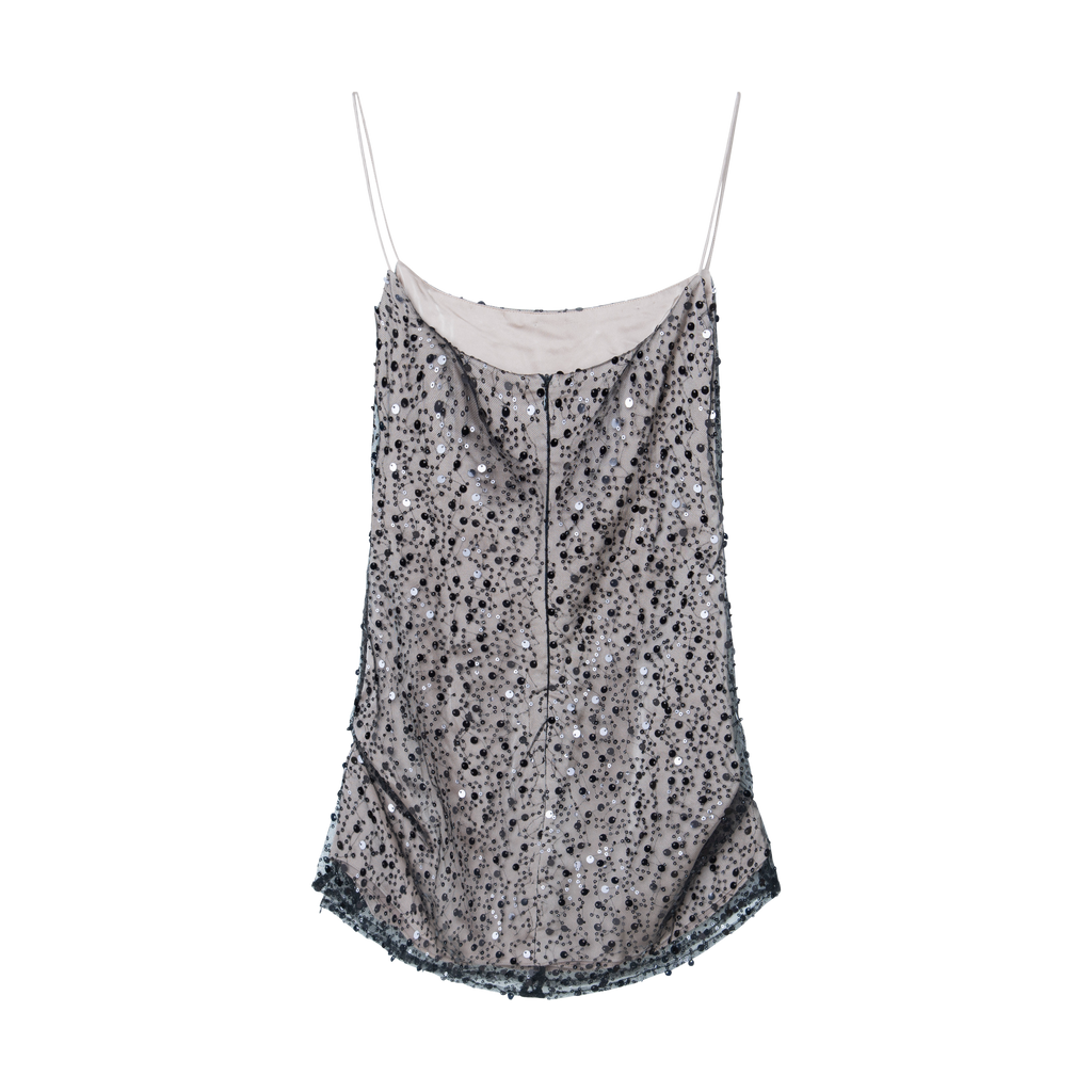 Gabrielle Dress - Sequin Black features slim fit, straight front and back, non-stretch fabric, spaghetti straps, slit on both sides, and back zip.