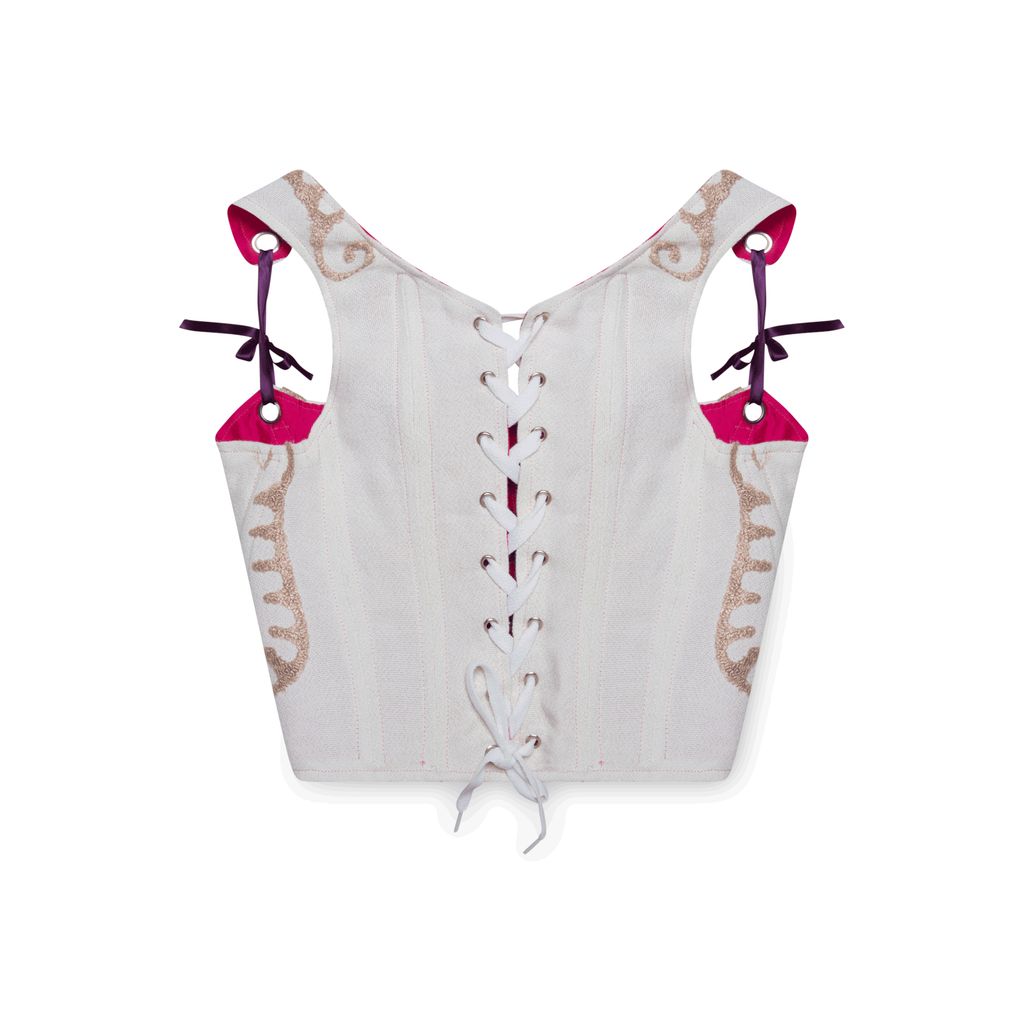 Sign of the Sagittarius Corset features upcycled vintage 1940s tapestry, lined with deadstock silk and structured by plastic boning, upcycled from packaging tape sourced from Cardiff Market.