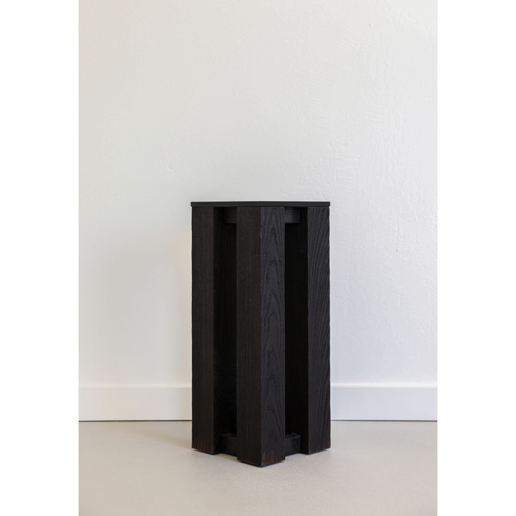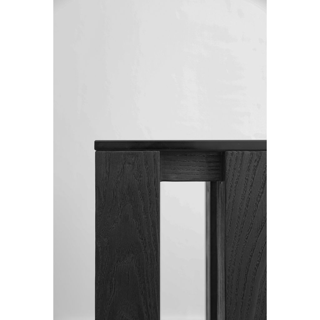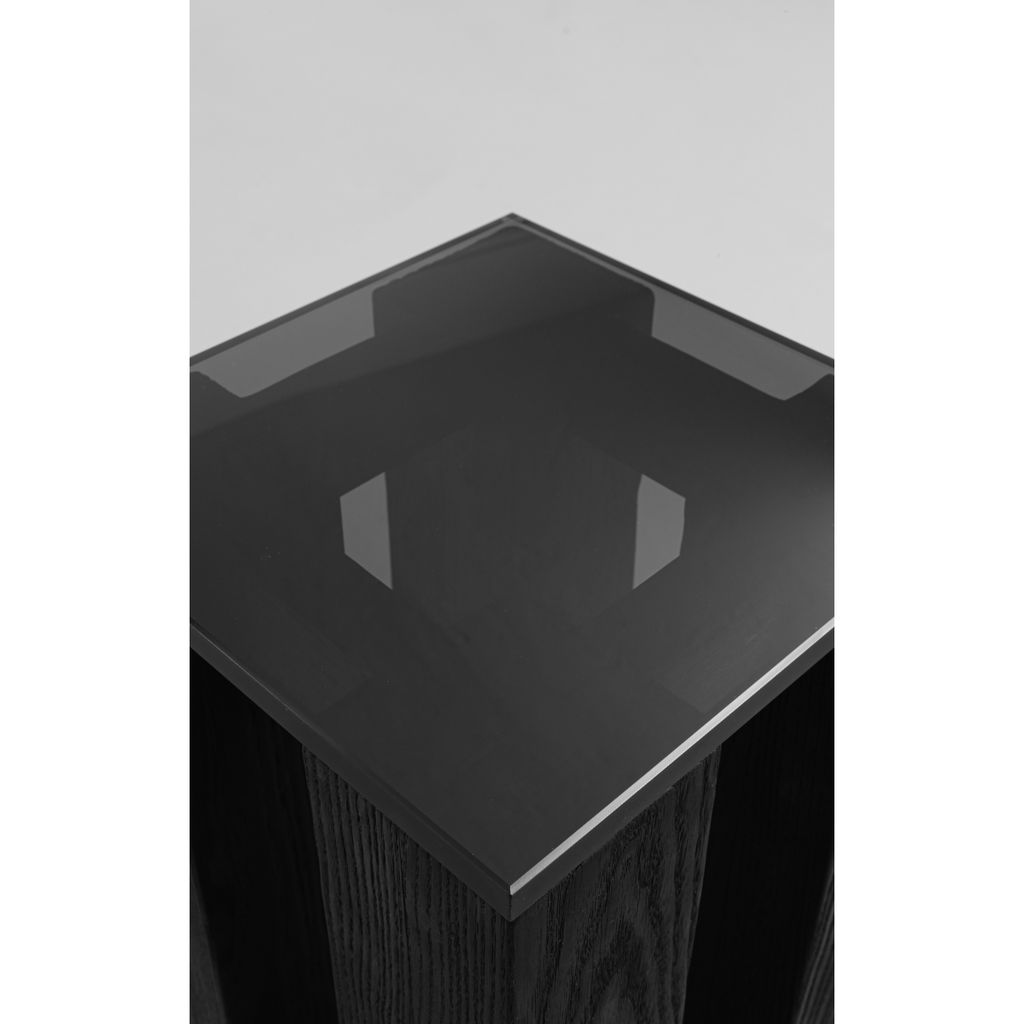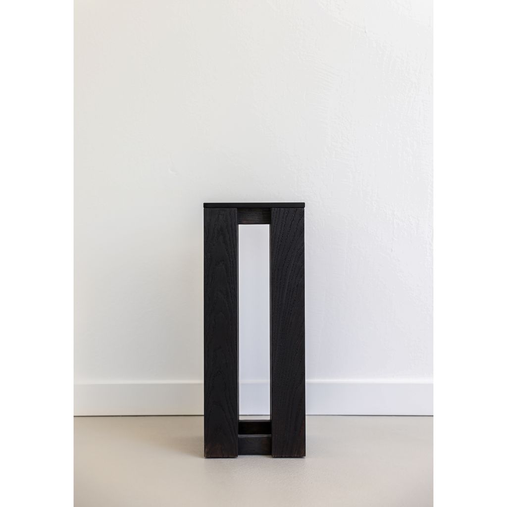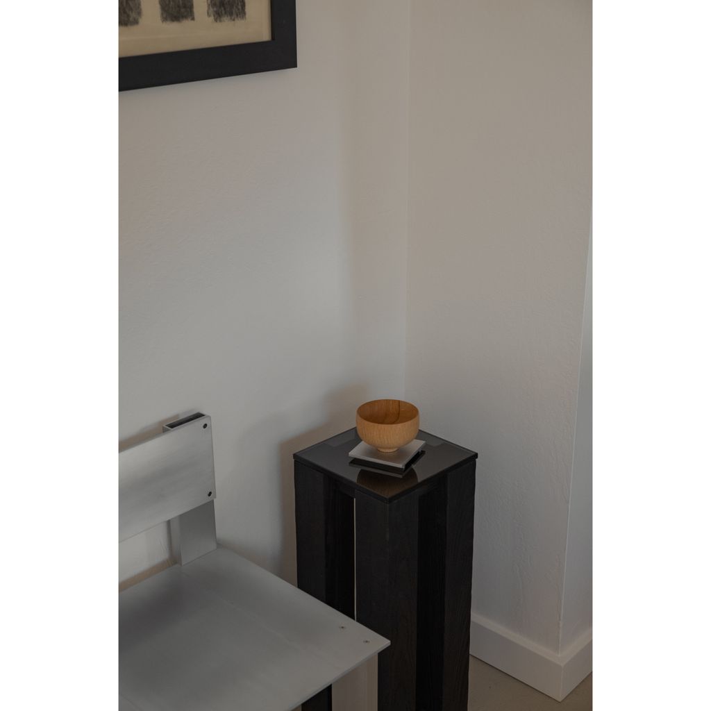T-03 was designed to harness opposites: light and dark, solid and void, an exercise in juxtaposition. Inspired by the framework of large scale concrete buildings (pillars/joists) as well as the perfect grid patterns found in many architectural plans, the table employs a system of 4 equal “pillars”, and 8 “joists” that position the pillars a distance from each other that is equal to the pillar itself. In a bright room, the negative space is obvious, however as the sun sets and the room darkens, it becomes more difficult to pick up on the nuances, transforming into one monolithic black plinth. Built out of solid Ash, the black coloring is not a stain, rather the wood has been torched over and over to achieve this color. The repeated torching creates an exceptionally dynamic and rich color. Direct sunlight reveals its true tones, not quite black, an intense brown that’s just shy of black. This depth and richness cannot be achieved with dyes. Additionally, the torching removes the soft grain of the wood, resulting in a highly textured surface. These nuances can only truly be experienced up close, creating a uniquely intimate relationship. A thick glass top completes the piece and allows the joinery methods used to remain obvious.
