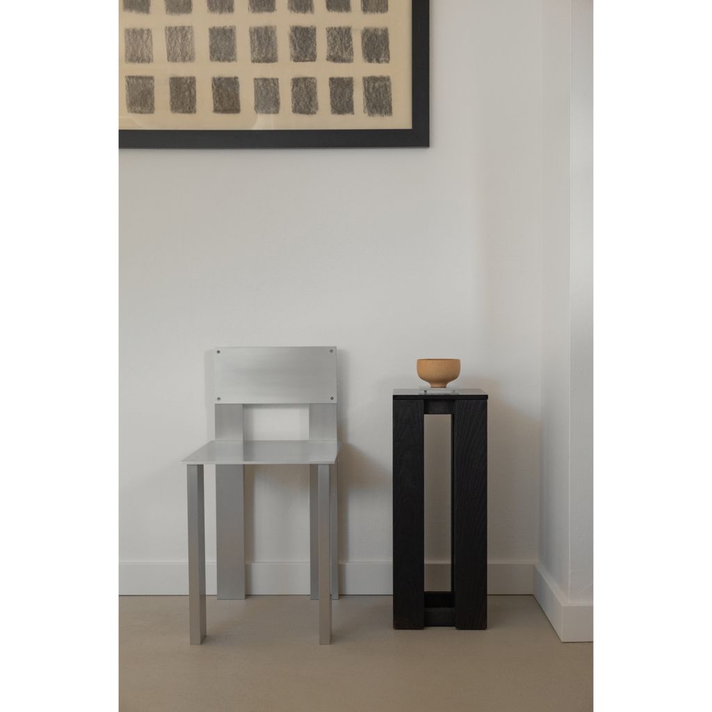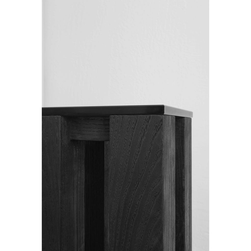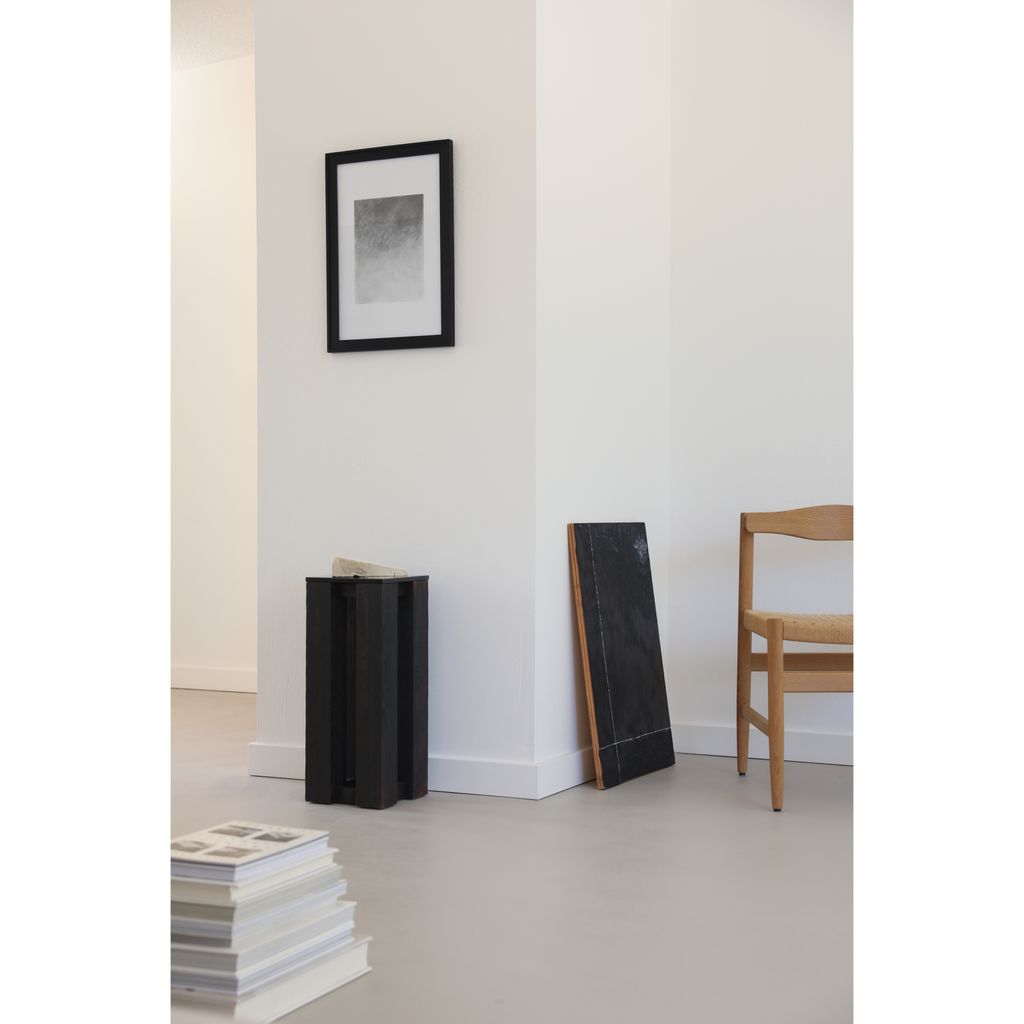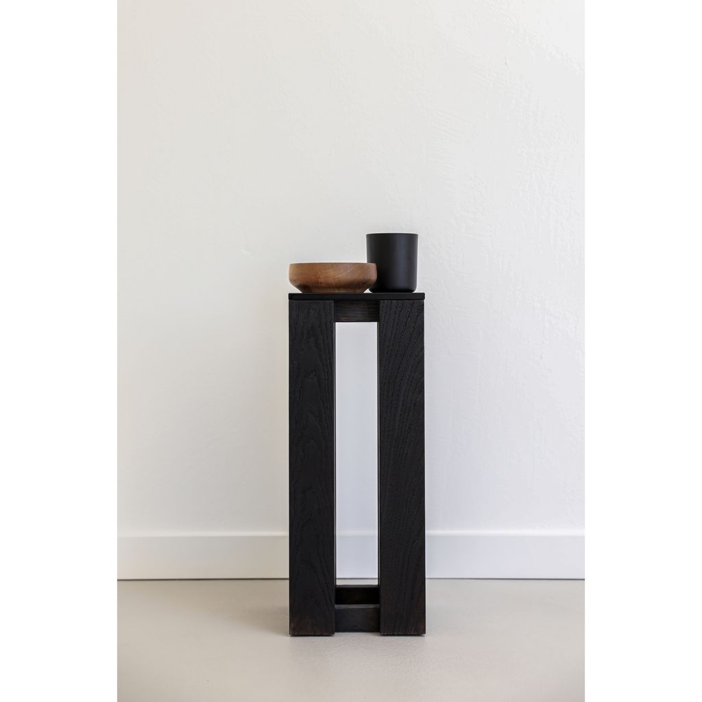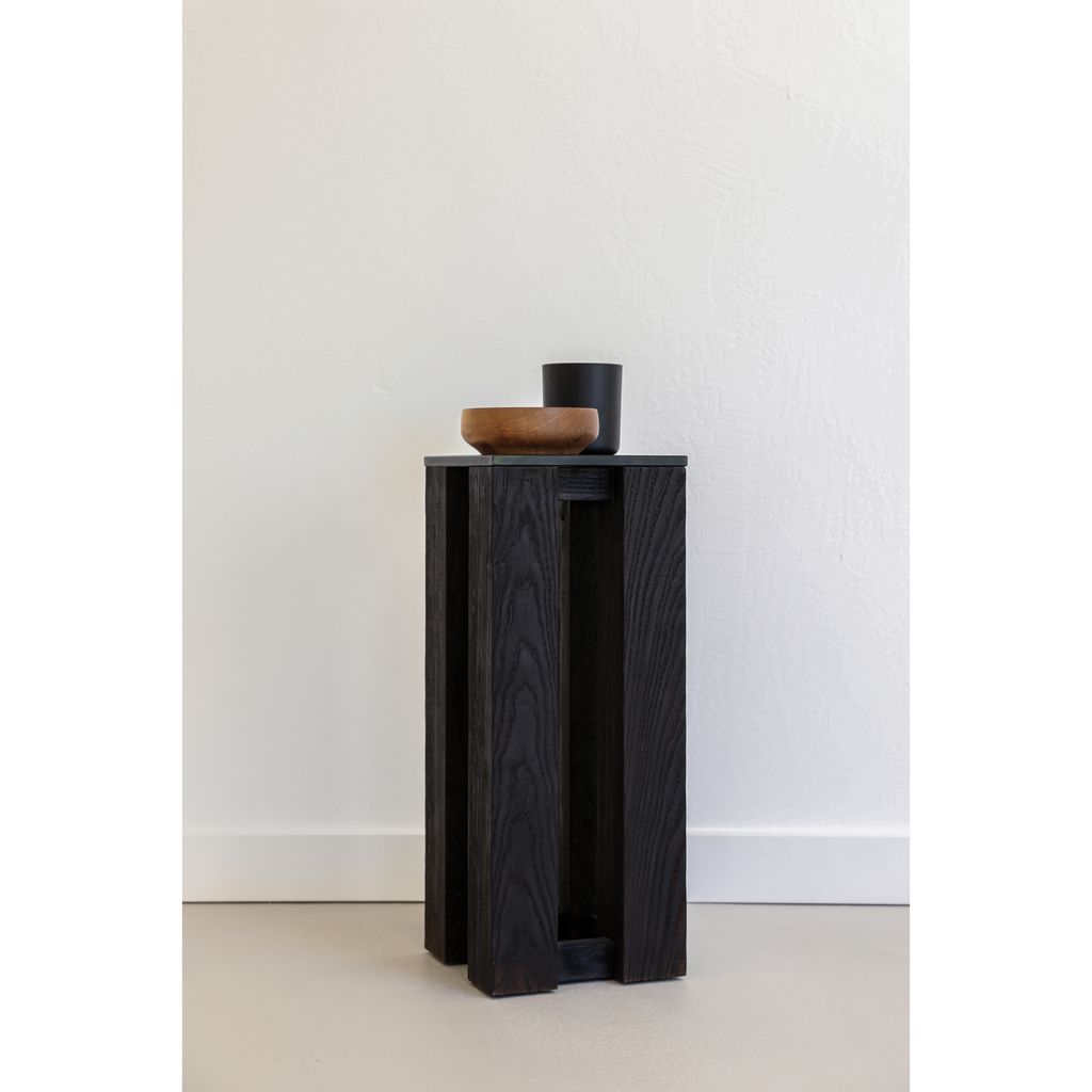 T-03 was designed to harness opposites: light and dark, solid and void, an exercise in juxtaposition. Inspired by the framework of large scale concrete buildings (pillars/joists) as well as the perfect grid patterns found in many architectural plans, the table employs a system of 4 equal “pillars”, and 8 “joists” that position the pillars a distance from each other that is equal to the pillar itself. In a bright room, the negative space is obvious, however as the sun sets and the room darkens, it becomes more difficult to pick up on the nuances, transforming into one monolithic black plinth. Built out of solid Ash, the black coloring is not a stain, rather the wood has been torched over and over to achieve this color. The repeated torching creates an exceptionally dynamic and rich color. Direct sunlight reveals its true tones, not quite black, an intense brown that’s just shy of black. This depth and richness cannot be achieved with dyes. Additionally, the torching removes the soft grain of the wood, resulting in a highly textured surface. These nuances can only truly be experienced up close, creating a uniquely intimate relationship. A thick glass top completes the piece and allows the joinery methods used to remain obvious.