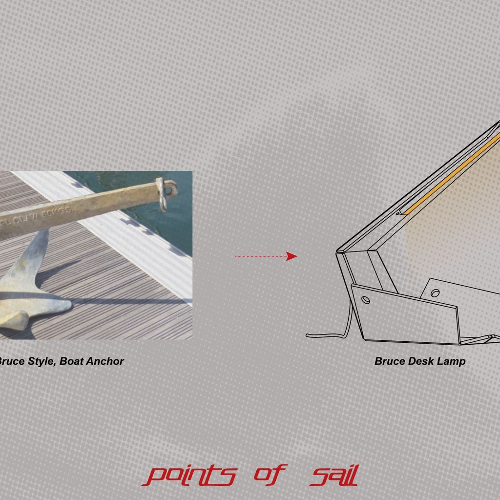 Some sea beds are tough and rocky, others are soft and sandy. Different sea beds call for different anchors. The Bruce Desk Lamp is inspired by the form of Bruce-style anchors, which takes the shape of a claw to grip the ground beneath the water. Versatile in its design and low cost with one-piece construction, the Bruce Anchor offers stability on most seabeds.