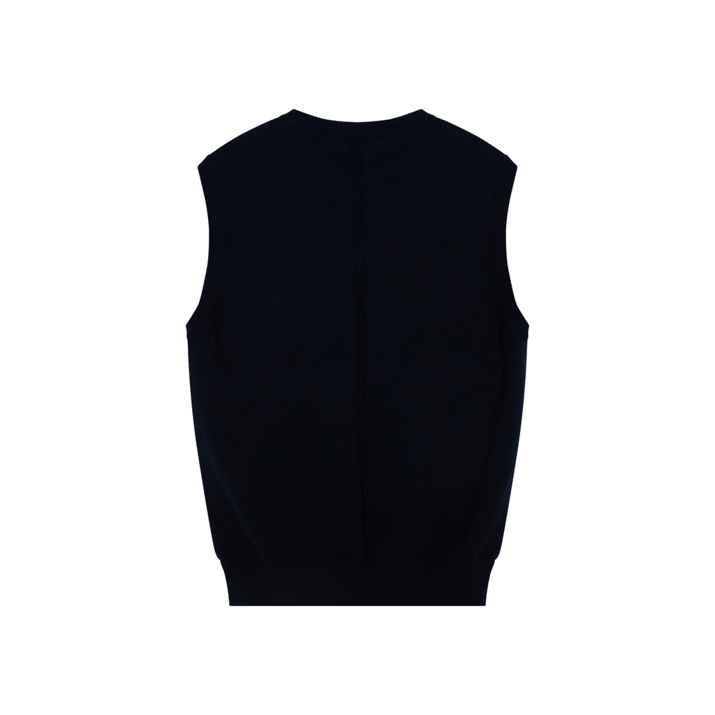 The Row Cremona Merino Wool and Cashmere Blend Vest in Navy Blue features slip on style, slim fit, and V-neck.