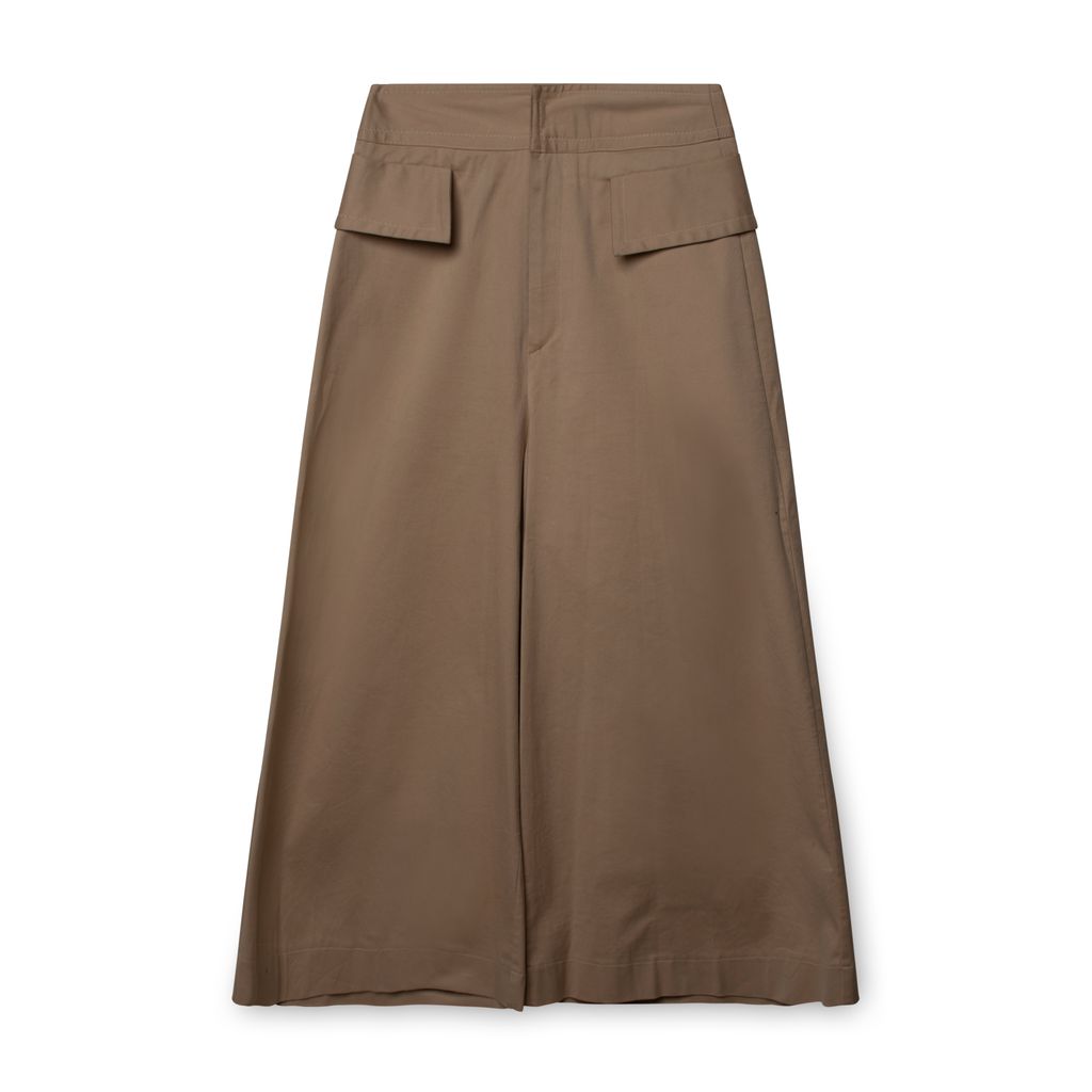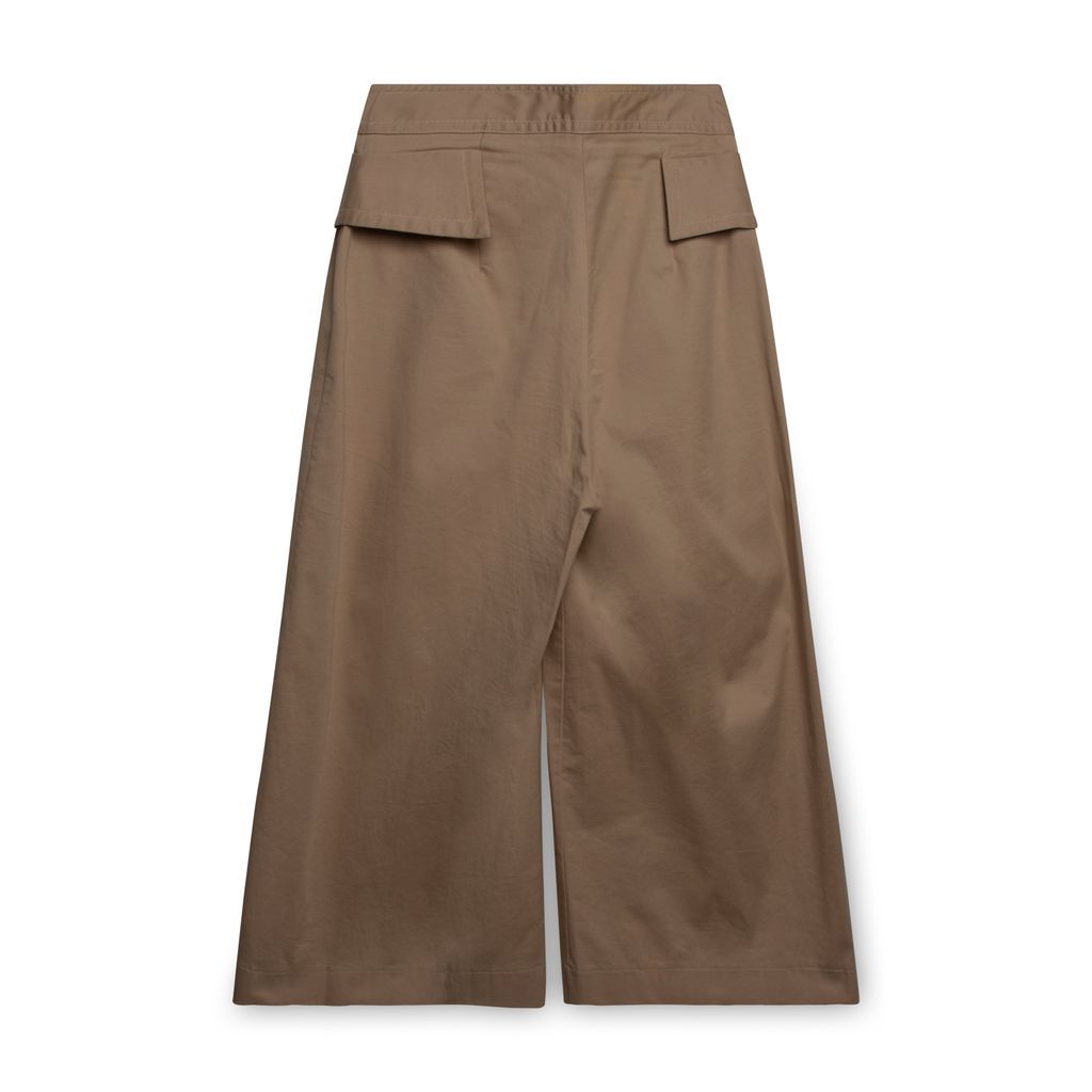 TheOpen wide leg cropped trousers features wide leg, two nonfunctional pockets, and zipper/ hook & eye closure at center front.