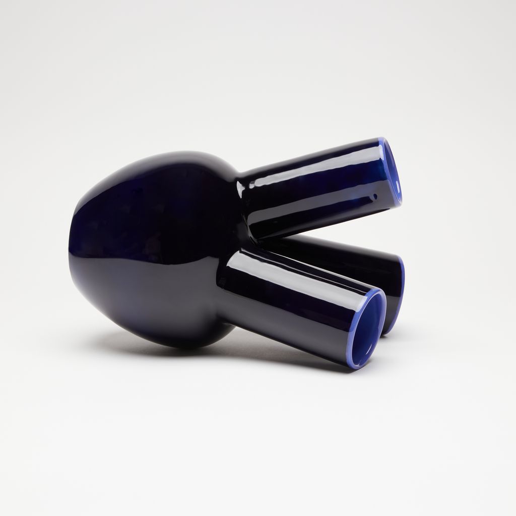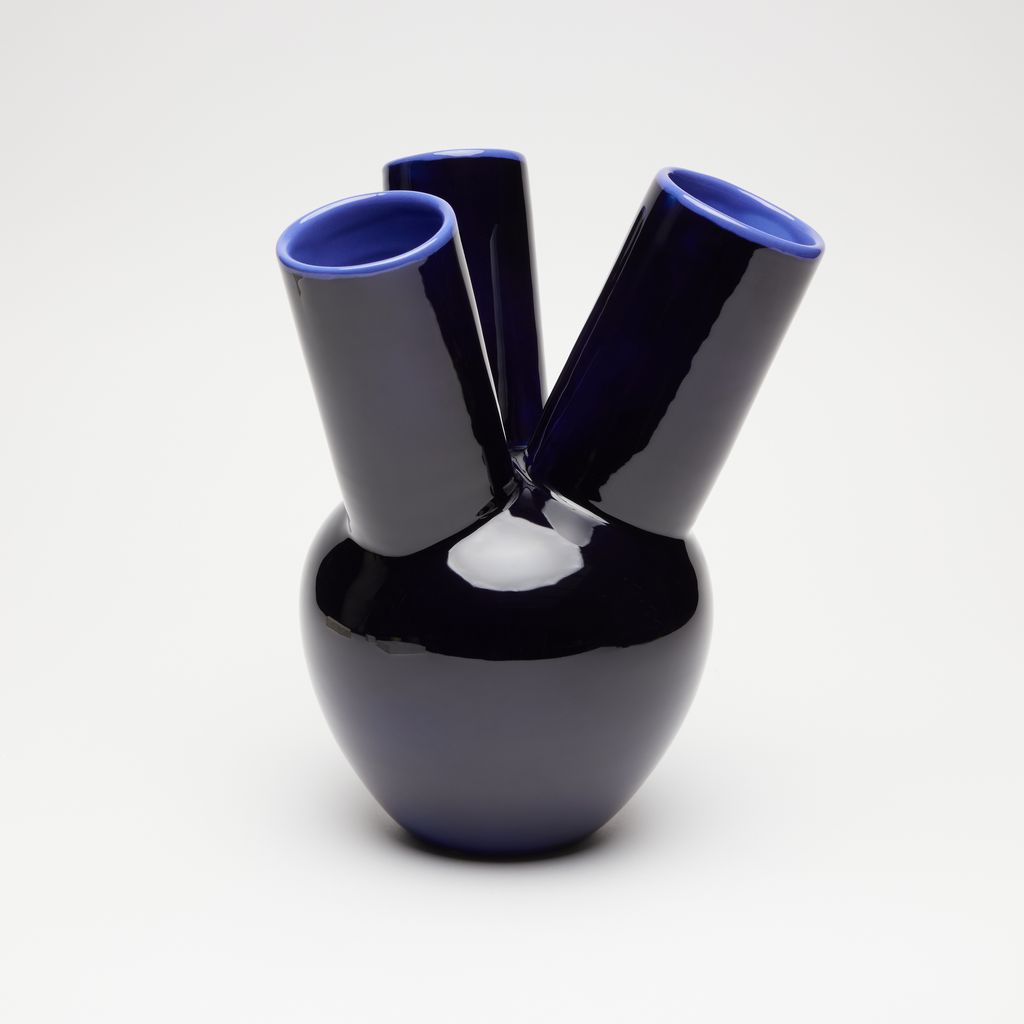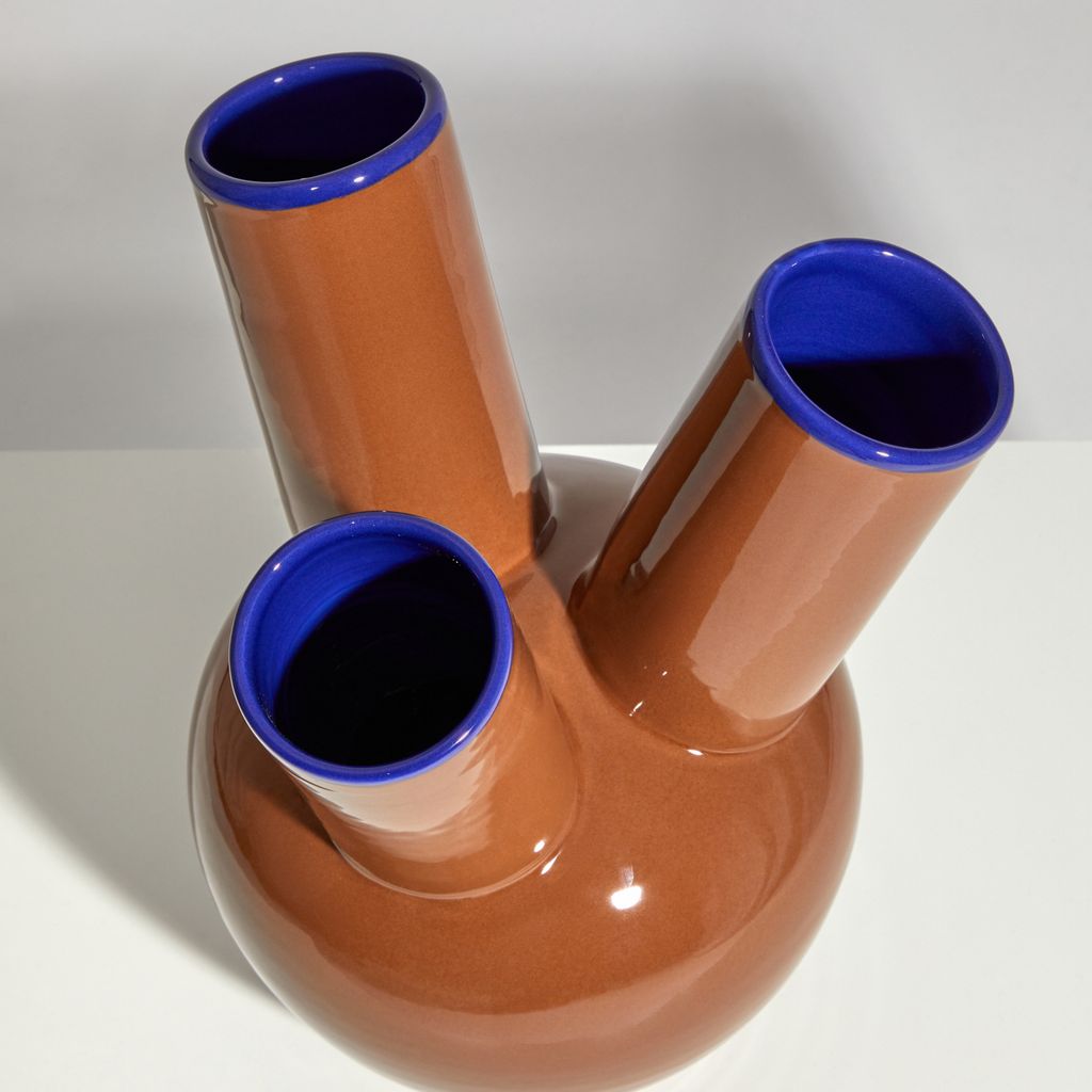 Vase with a spherical lower part and three projecting cylindrical openings in the upper part. Hand-colored with two colors, one for the inside and one for the outside.