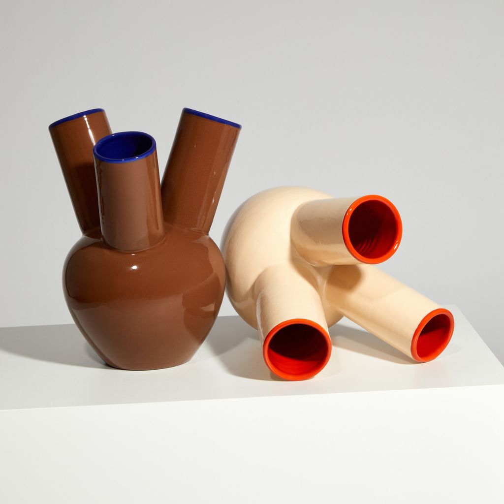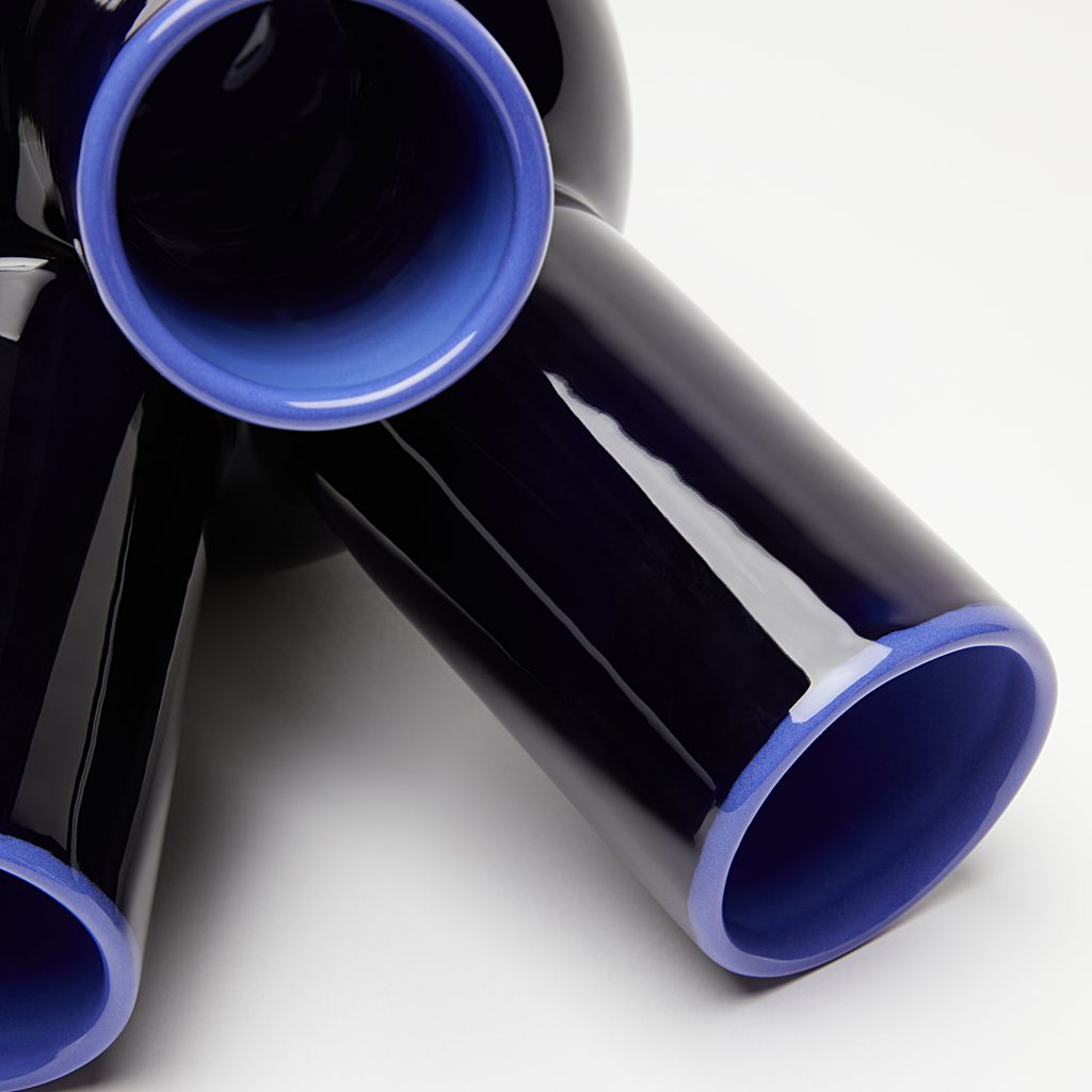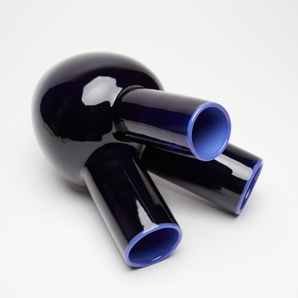 Vase with a spherical lower part and three projecting cylindrical openings in the upper part. Hand-colored with two colors, one for the inside and one for the outside.