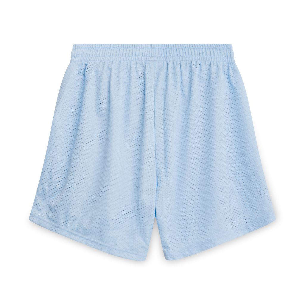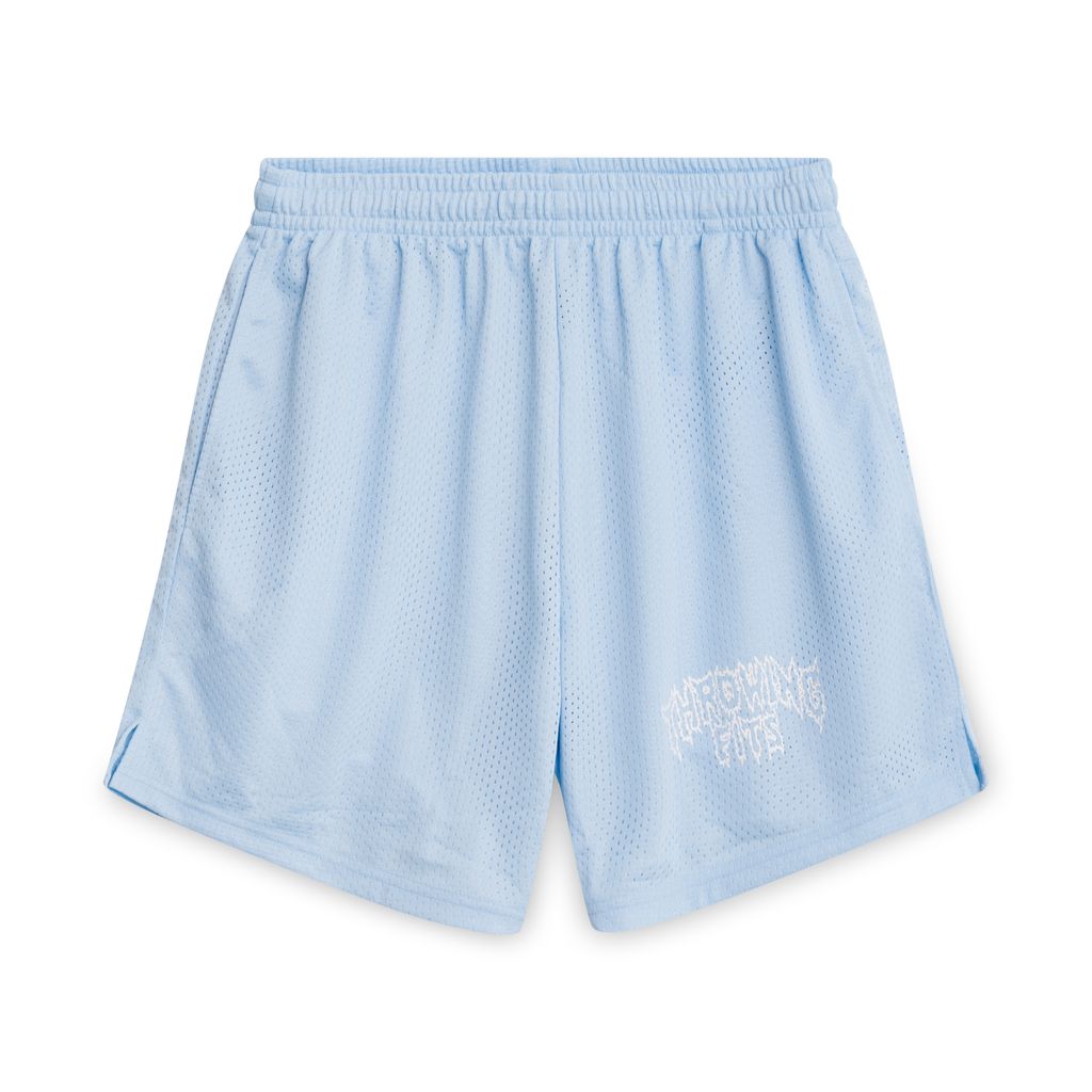 Throwing Fits BlueMesh Shorts features drawstring waistband and logo on left leg.