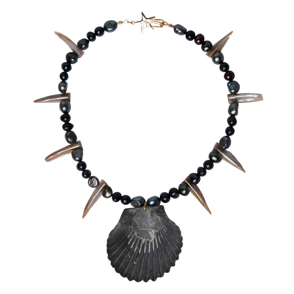 Twilight Armour Necklace features a genuine dark blue scallop seashell, pearl spikes, dark blue freshwater pearls, and a 18k gold plated iridescent star hook. This necklace is inspired by the strength and protection of the sea. Due to the nature of the seashells, please be gentle when handling and wearing!