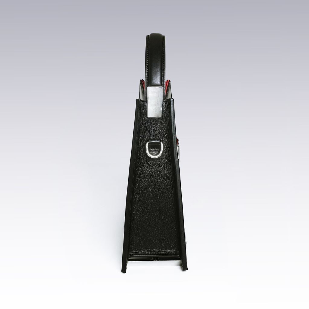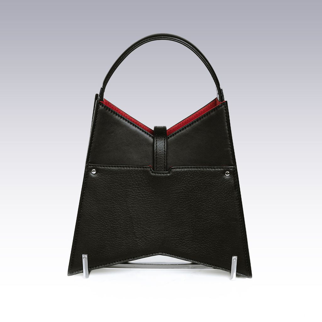A versatile leather handbag inspired by the brutality of corporate architecture. Details include blood-red microsuede lining, metal cage, and a magnetic ID front closure. Details: - Smooth & grained calfskin leather - Custom metal stilts and hardware trimmings - Single exterior slip pocket - Two interior slip pockets and leather cardholder slot - Magnetic ID front closure - Adjustable crossbody strap