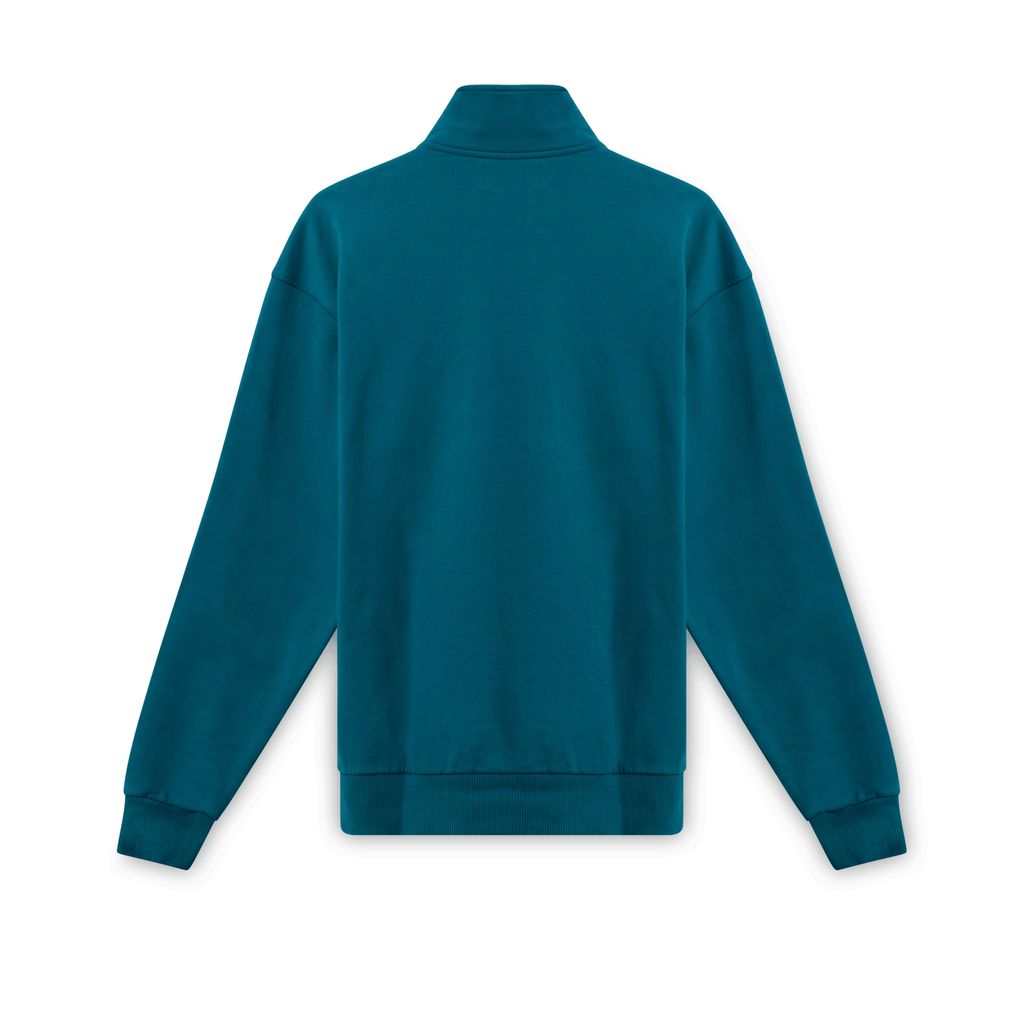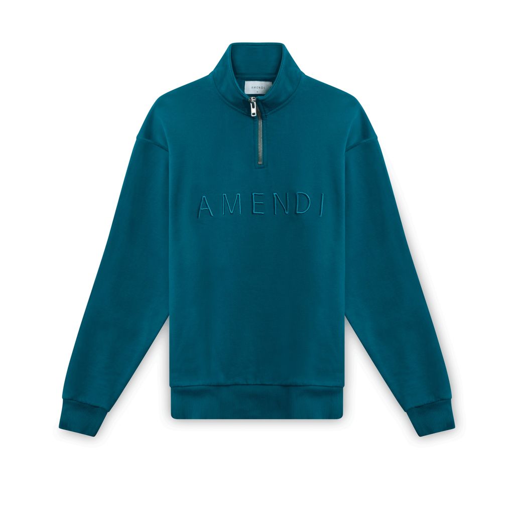 Turqoise sweatshirt with the Amendi brand name on the chest, and a zipper reaching down to just above the brand name.