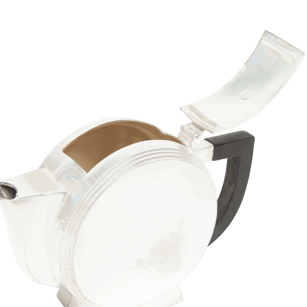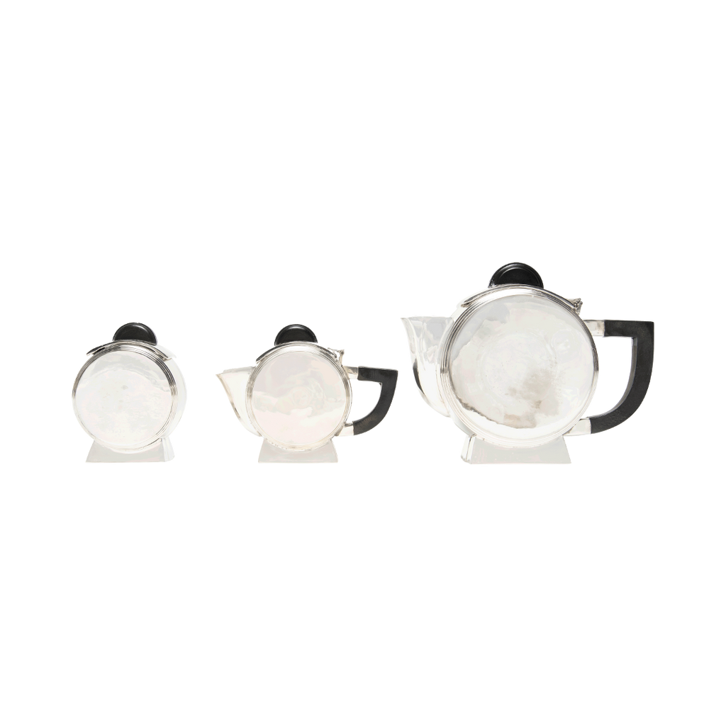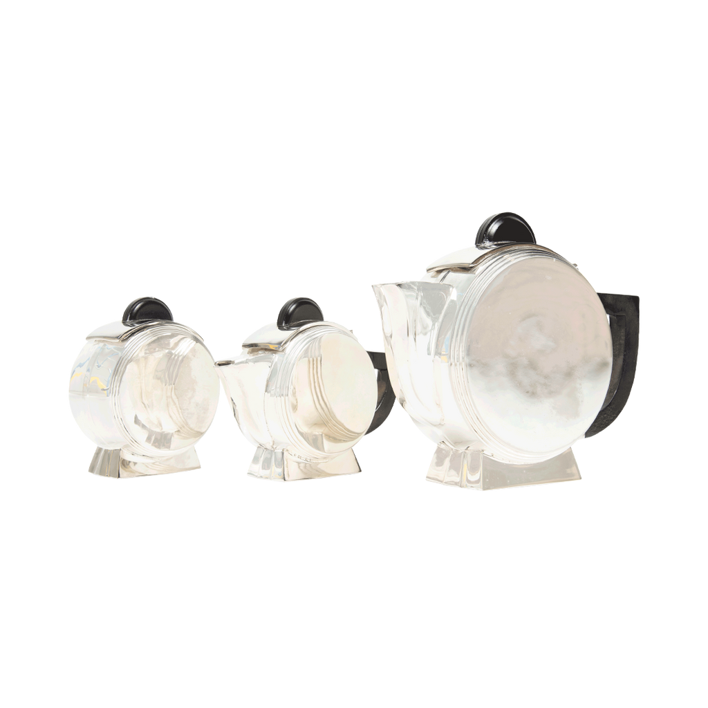 Vintage Art Deco Tea Set is a silver plate art deco tea set with bakelite handles, c. 1930s and made in the style of Christian Fjerdingstad for Christofle. The set includes teapot, creamer, and sugar dish.