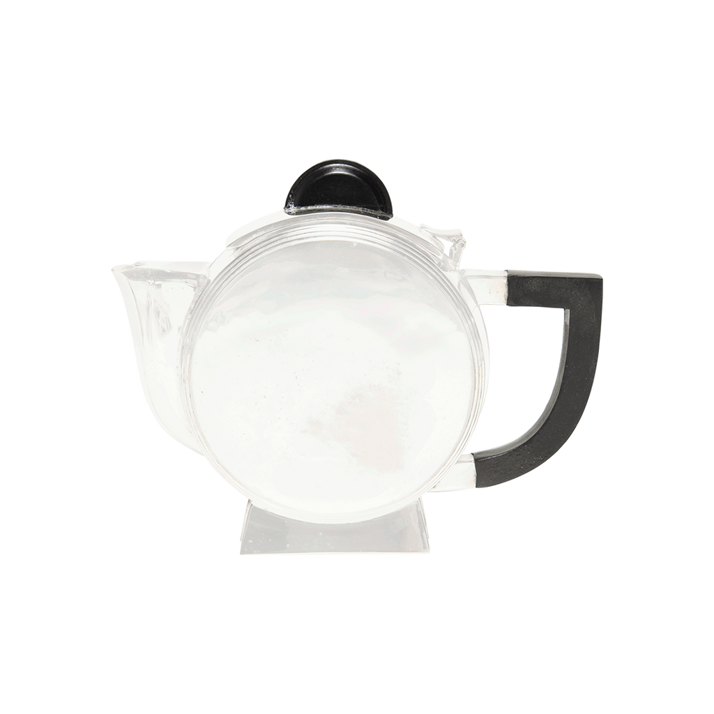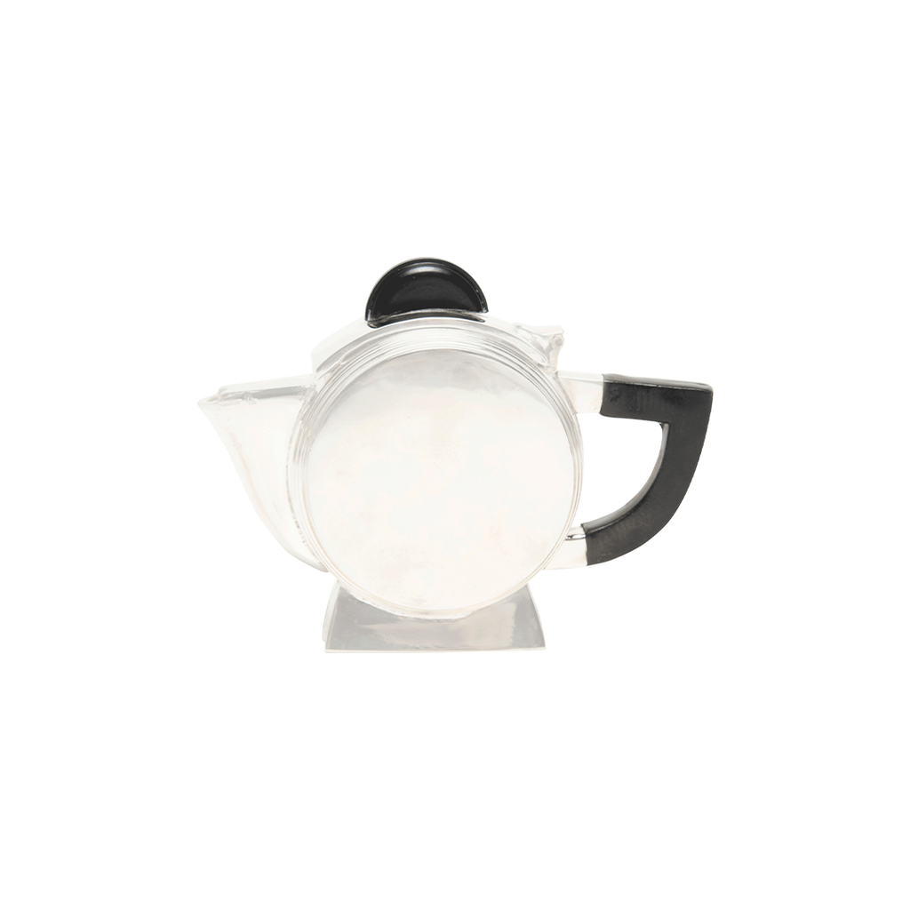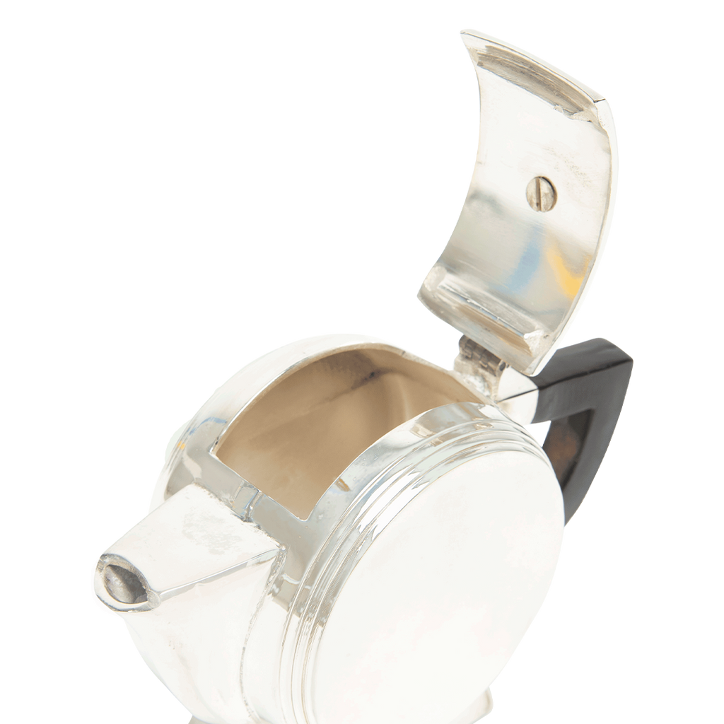 Vintage Art Deco Tea Set is a silver plate art deco tea set with bakelite handles, c. 1930s and made in the style of Christian Fjerdingstad for Christofle. The set includes teapot, creamer, and sugar dish.