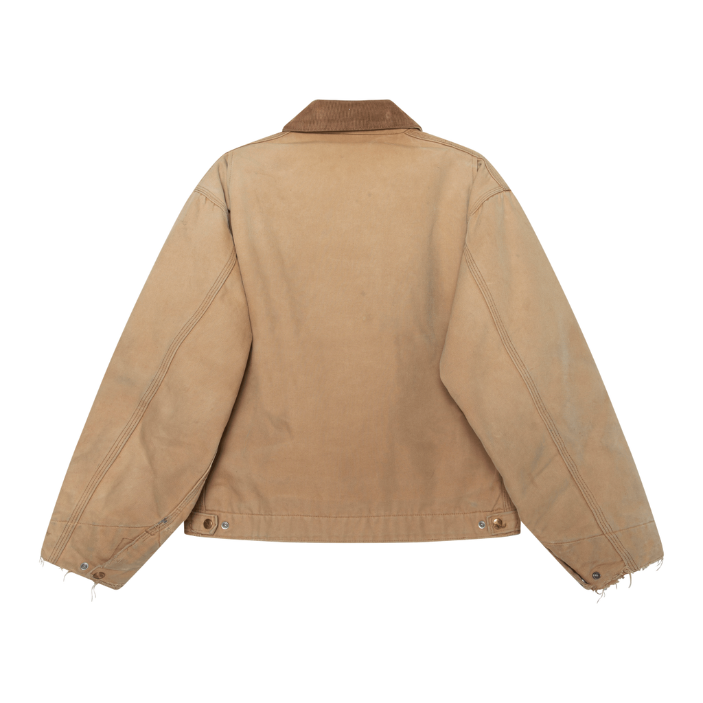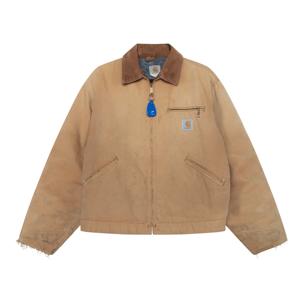 Vintage Carhartt Workwear Jacket features 2 front pockets, 1 zippered chest pocket, corduroy collar, front zip closure, and distressing on sleeves and cuffs.