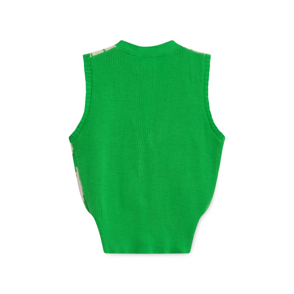 Vintage Green Golf Vest features button closure, pattern on front, ribbing at hem.
