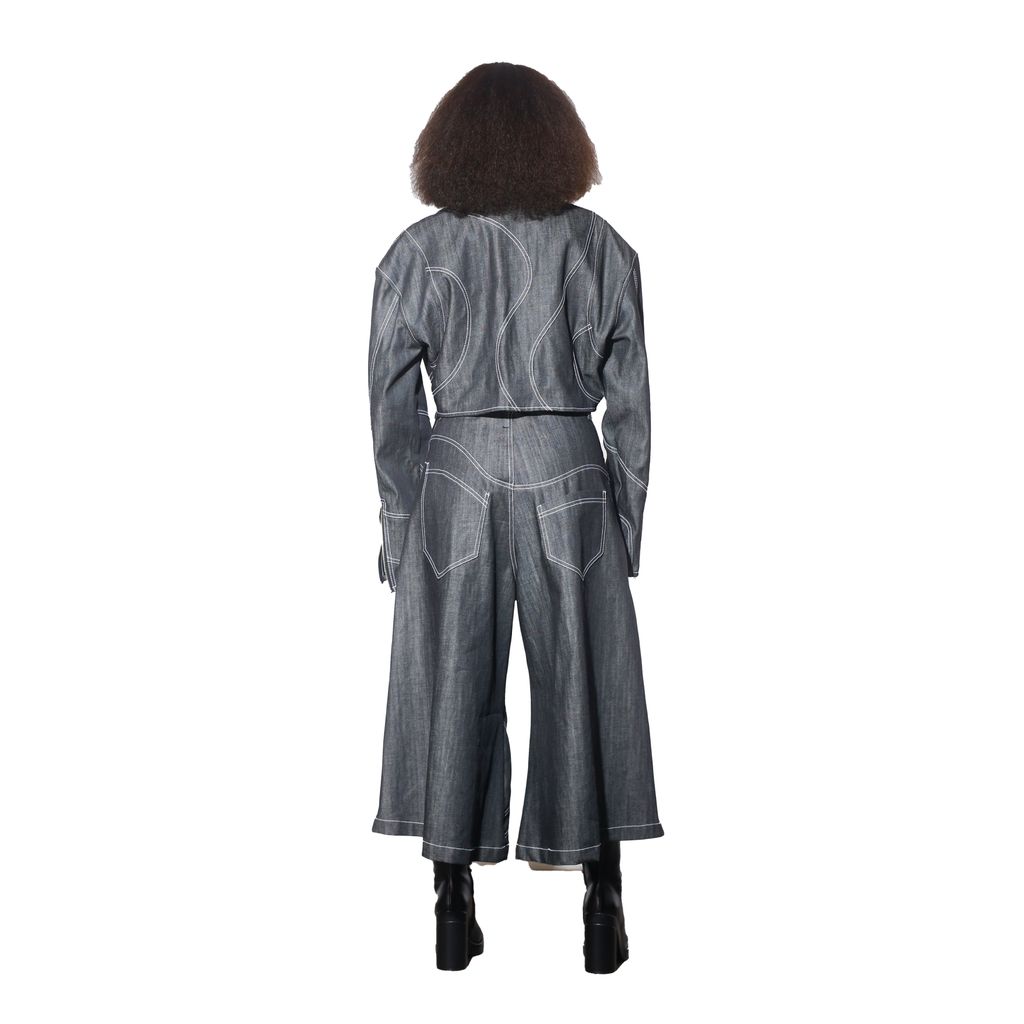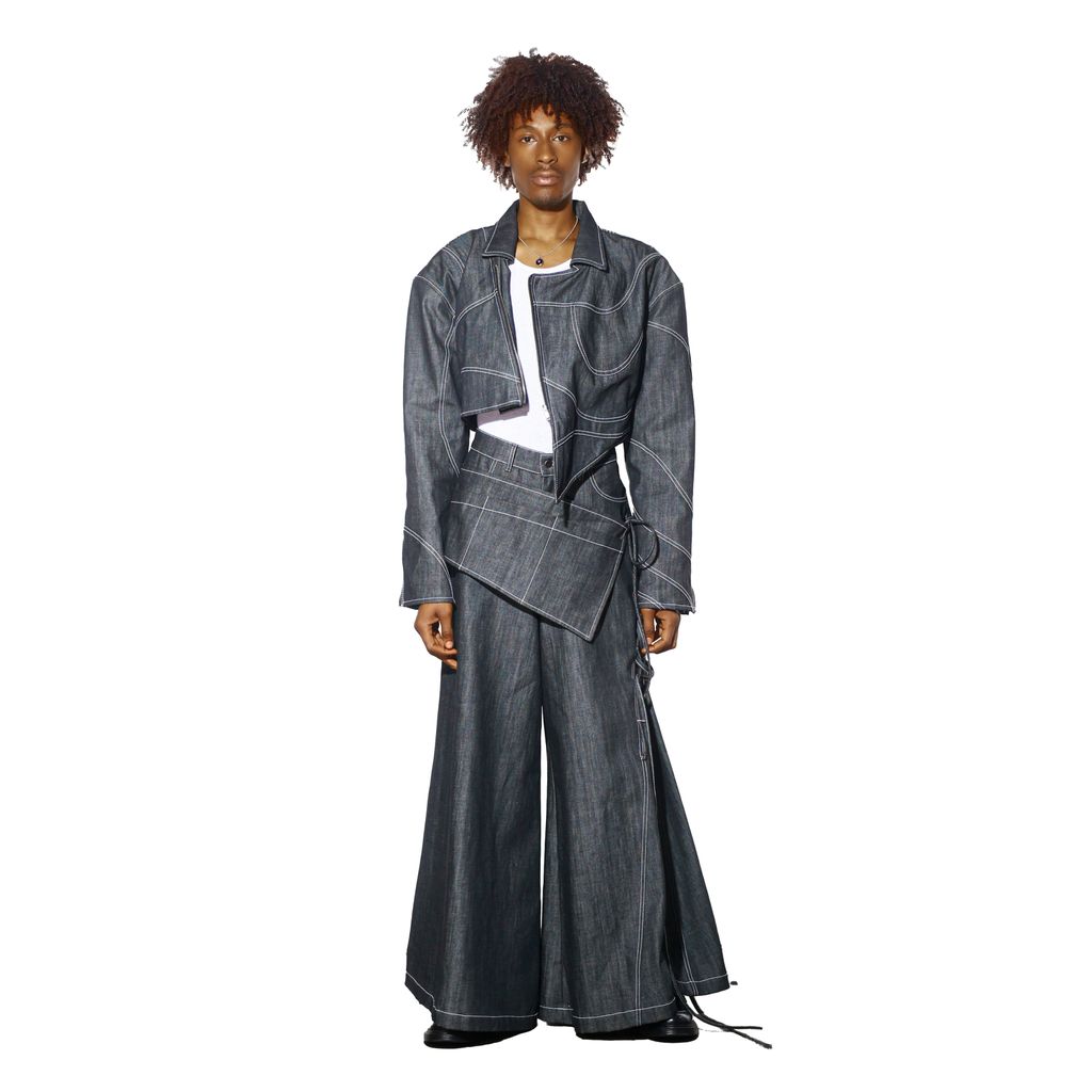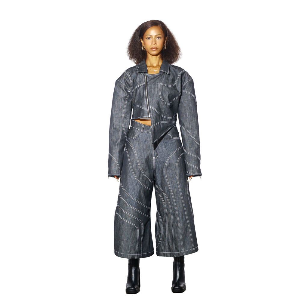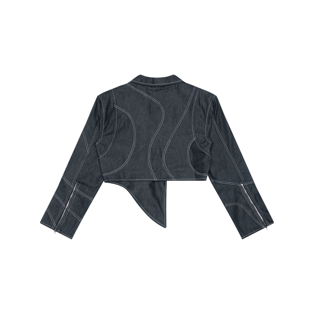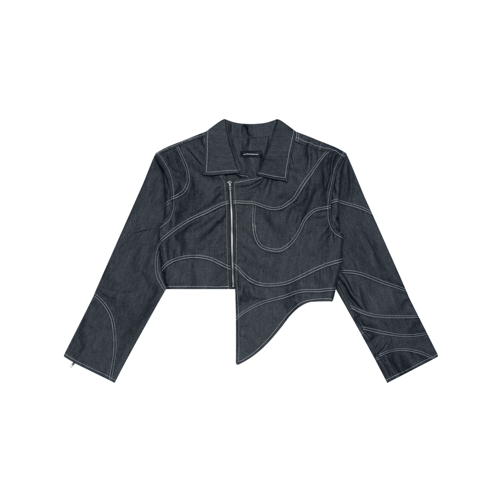 Wave Moto Jacket is a denim jacket made from raw denim and cut boxy with dropped shoulders. It features swirl seaming with contrast stitching, asymmetrical front with zip front closure, extended sleeves, sleeve zipper detail, and unisex fit.